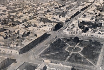 En ésta antigua toma podemos observar la zona de la plaza y el boulevar de la Av. León Gallardo (actual Av. Perón), que con mas detalle se muestra en la siguiente fotografía